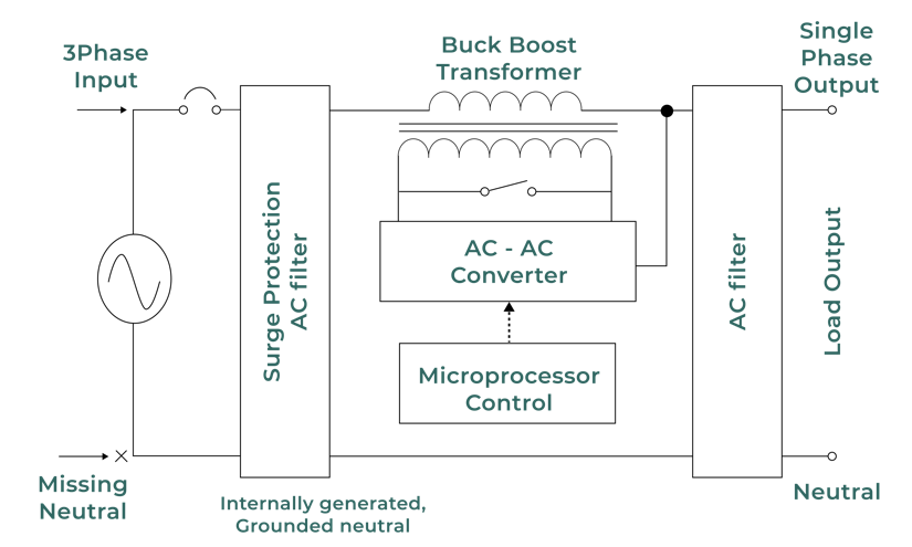 This cutting-edge three-phase precision AC voltage regulator is powered by the innovative Healthy Phase Selection (HPS) system. It selects the two best incoming voltage phases, ignores the third phase and the incoming neutral, and provides a stabilized single-phase output with a fresh grounded neutral.